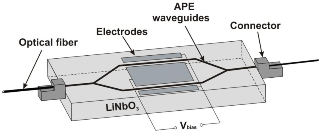 圖2 一種鈮酸鋰電光調(diào)制器,通過調(diào)節(jié)施加電壓以調(diào)控光波導(dǎo)內(nèi)的光強。